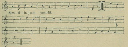 3. Ztratila jsem pentlíh. Melissaeus v notaci svých nápěvů hojně užíval paus. Někdy až zbytečně prokládal jimi zpěvní úryvky. Na následující písni možno to pozorovati velmi dobře.