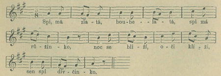 Vojtěch Nejedlý zanechal nám lyrickou »Ukolébavku« — »Spi má zlatá, boubelatá, spi má hubinko, noc se blíží, oči klíží, hajej, miminko«. Složena byla r, 1795.12) Brzy zlidověla. Jan Jeník rytíř z Bratříc uvádí ji ve svém rukopise z r. 1838.1S) Zpívávali jsme ji asi v letech 1890—95 na Chržíně u Velvar takto: