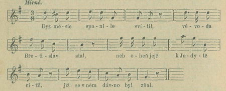 Dyby i za Rejnem byla přede mnou ustraněná, dyby ji nebesa kiyla, Judyta musí být má. Tak pravil, osedlal koně, Břetislav ke Brodu jel, kde cí-ař v klášterním dvoře Judytu ukrytou mři. Blíž kláštera v zeleném křoví skryl knize panoäe své, přez hory, doly a lesy J ospíchal k milence své. A ránu dyž pany pěly, Břetislav v klášteře stál, a s kůry dyž jíti pak měly, na koní Judvtu vzal. Pany se d., kŕ ku daly, strážnici pádili ven,