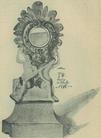 minové podušce se 4 žlutými třapečky v rozích; poduška spočívá na zeleném, černě čárkovaném podstavci; celá soška je 21 cm. vysoká, s podstavcem 23 cm. dlouhá a 14'5 cm. široká a určena byla za ozdobný vrchol kamen. Ve spodní duté části podstavce vepsána černá písmena