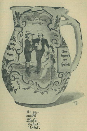 11. Džbán »politický« s trojici rozjarených bratří: Hanáka, Slovana, Uhra (Slováka), s metropolemi hanáckými Vyškovem a Prostějovem ľ. 1865.