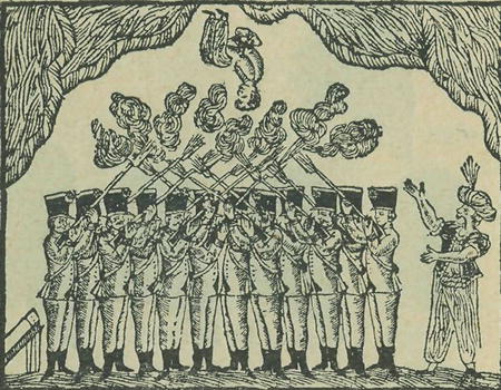 Kulturně-historicky zajímavé jest vyobrazení středověkých, až do XVII. století oblíbených panských zábav, honění do kroužku a kvintany. Zve r. 1816 na představení Bach, majitel cirkusu, na rozloučenou, s lichotivou poklonou Pražanům. Kromě jiného budou prý tu rytíři kopími, oštěpy, kordy a pistolemi bodati, sekati, házeti a stříleti na hlavy Turků