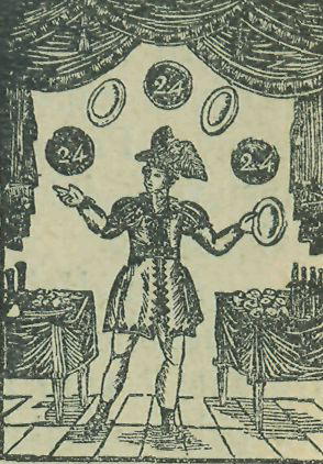 Do podobného ovzduší zavádí cedule, kterou se chlubí Sebastian Schwannenfeld, jak ve svém velikém fysikálním uměleckém kabinetu vykouzlí fantasmagorie, přirozené zjevy duchů, za hromu a blesku, jak se mihají, rostou, mizejí, vzdalují se, přibližují atd. Náš obrázek (č. 18) představuje útěk poděšeného šaška Pierrota před příšerným kostlivcem, jenž hrozí světákovi šaškovi, že poslední hodina jeho na přesýpacích hodinkách již vypršela. Hrálo se v sále v Platýze, o páté hodině přesně začátek, o půl sedmé hodině konec, mimo pátek, každý den. Na ceduli honosí se pan ze Schvannenfeldu, že sám toto umění vynalezl a sám provádí obratně tuto »bílou« magii jen s automaty a mechanismem.