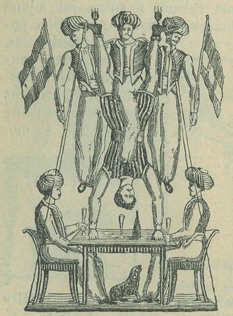 K obrázku č. 6. na str. 30. (Bataillen-sprung) druží se r. 1818 obdobný výkon v cirkusu Bachové. Umělec skokan le Picqus skákal přes stoly atd. Na závěr skočil přes 24 vojáky, šest klečelo na zemi, šest za nimi. Na daný povel od důstojníka vojáci střelili a v tom při skoku uchvátil jim umělec prapor a bez úrazu obě řady přemetem krkolomným přeskočil. Viz vyobrazení č. 28.-]-)