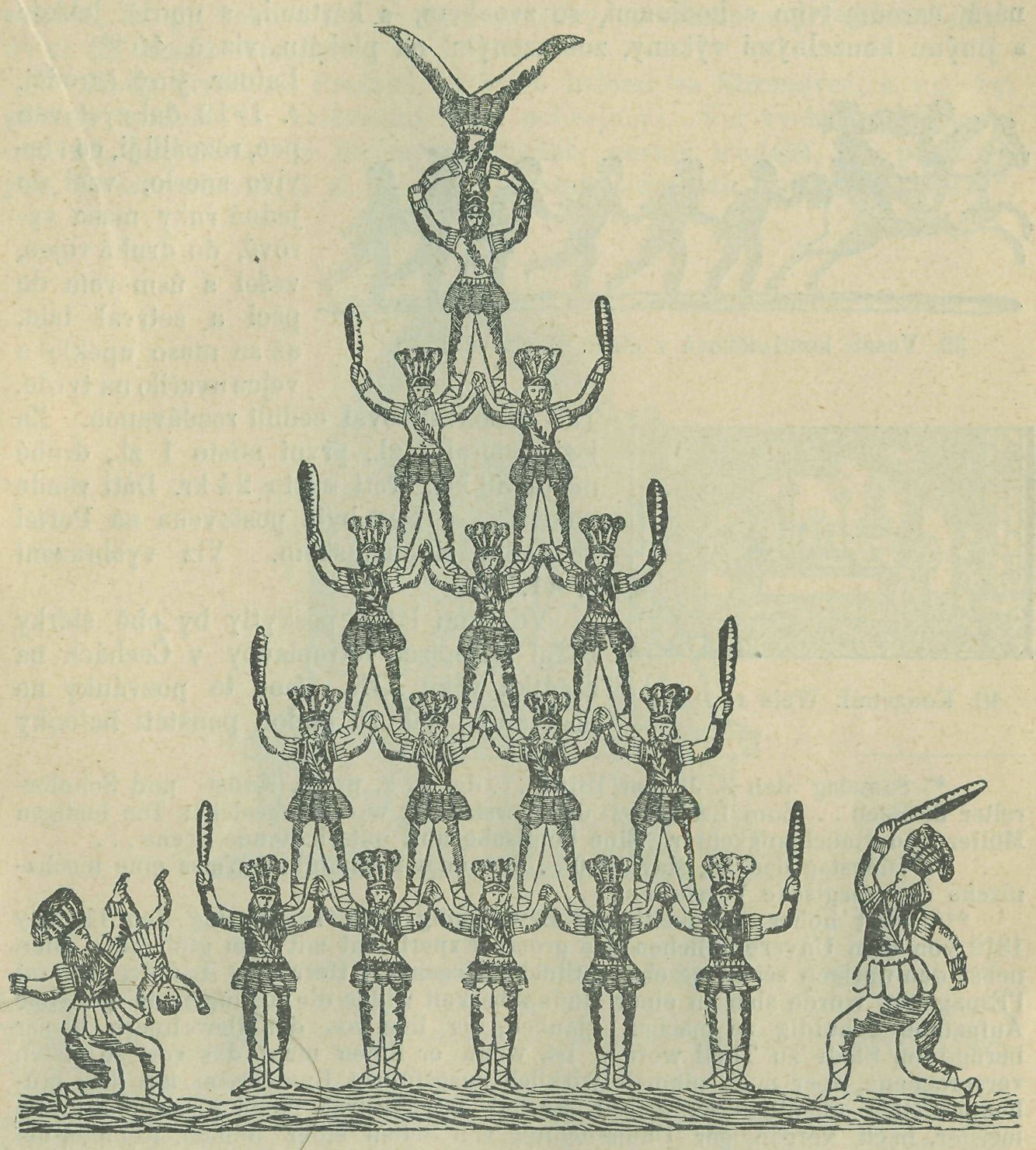 korunami na hlavách, s kyji v rukou, seskupilo se v malebnou egyptskou pyramidu, udržujíc do výše šesti postav lidských rovnováhu i tíhu