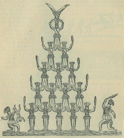 druhů na sebe postavených. Platilo se lože za 1 zl, první místo 30 kr., druhé místo 15 kr., poslední 10 kr. Obrázek náš podává názor, jak si počínali umělci při pyramidě. Obr. 38.*)