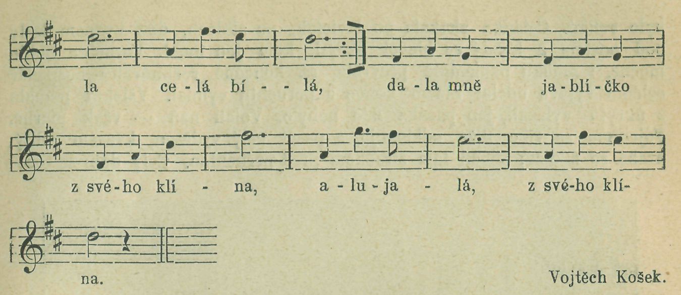 2. Já sem byl eště hoch nezkušený, sněd' sem to jablíčko naloupený. Jak sem ho sněd', celej sem zbíeď: Návrat mně, má milá, mou krásu hned!