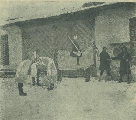drží na holi kobylí hlavu s plátěným ověškem. Na kobyle sedí voják. Kozlíci jsou hřmotnější než ve vsích na straně vorlické. Žid přijde k sed-