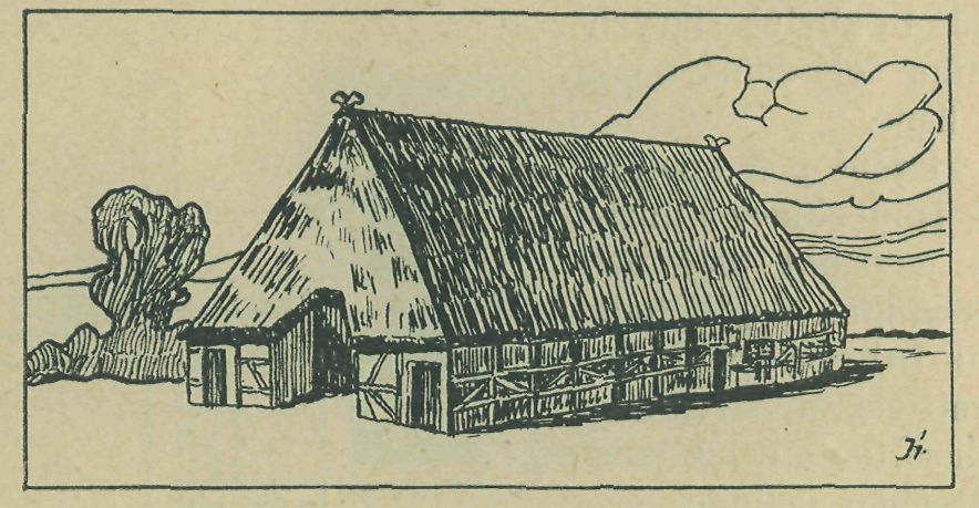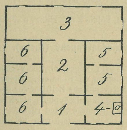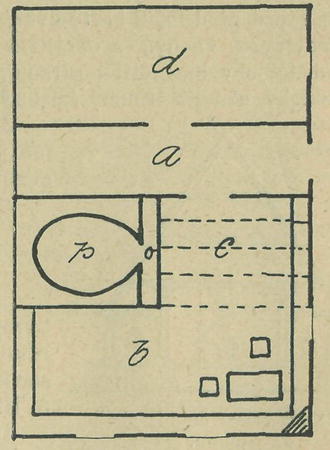 poněkud zvýšeno. Hlavní dveře vedou do síně (ös) moste ; na levo je jizba5) (b) s ohromnou pecí (p) a ohništěm (o), proti pecí mezi okny stojí stůl, nad stolem visí obraz některého svatého. Kol zdí lavice. Poblíže
