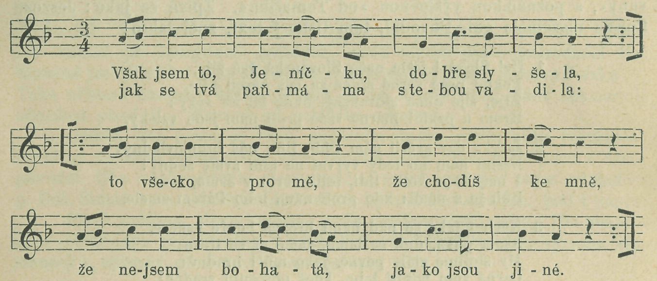 Však jsem to, Jeníčku, dobře slyšela, jak se tvá paňmáma s tebou vadila: to všecko pro mě, že chodíš ke mně, že nejsem bohatá tak jako jiné.