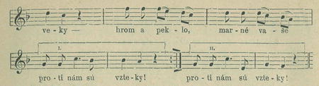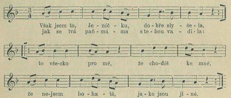 Kdo k nám chce choditi, kdo mě chce míti, musí mou matičku pěkně prositi, smekat klobouček, líbat ručičku: dejte mně, paňmámo, vaši Aničku.
