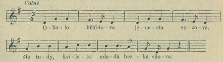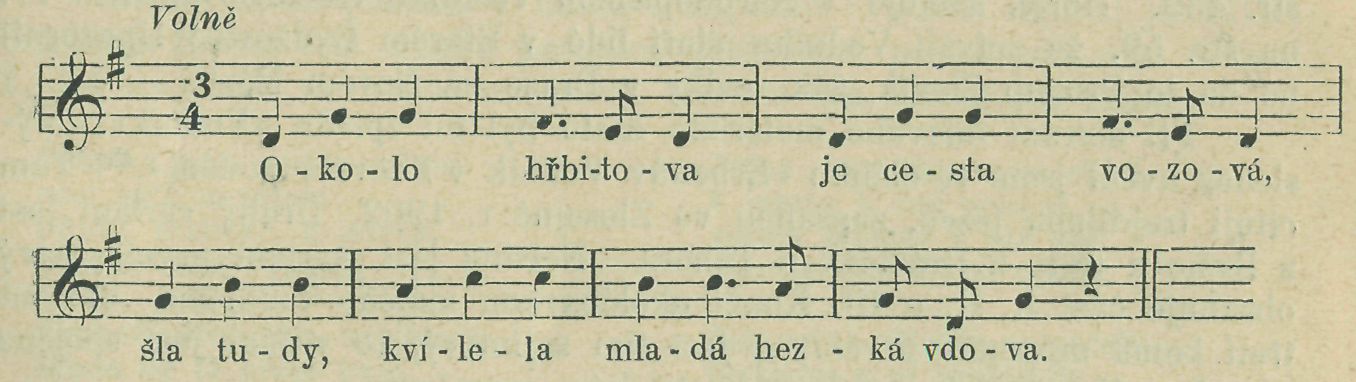 tuje první sloku s nápěvem. V textu není význačných změn, ale kde v Erbenově básni vyskytují se tři řádky téhož rýmu, opakuje se třetí, by vzniklo čtyřverší. Na Prachensku sebral ji Holas a uvádí první sloku s nápěvem z Vraže.42) Bohužel další sloky úplně jsou pominuty, tak že nevíme, íkterých změn báseň doznala. A bude změn zajisté dosti, jak souditi můžeme z nápěvu. Nemá-li tento býti zkracován — a nápěvy lid nečasto mění, spíše jim přizpůsobuje text — musí se některé verše opakovati nebo vynechati. Jiných variantů neznám. Doptával jsem se častěji na Podřipsku, nikdo však ji neznal.