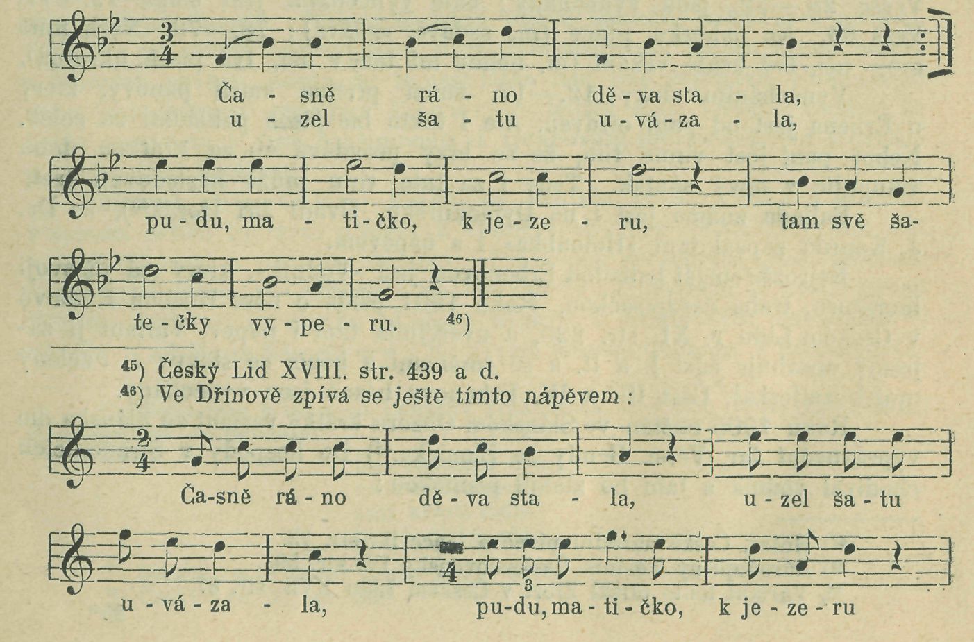 Při sbírání lidového materiálu často byl mi zpíván »Vodník«. Výsledek uvedl jsem ve článku »Erbenův Vodník v lidovém podání«.45) Tam cituji trojdílnou píseň, zapsanou ve Zlosejně r. 1902. Druhý variant jest z Byšic a třetí z Dražiěek u Tábora. Nejširší jest variant první, který obsahuje část I., II. a III. Končí ukolébavkou malého vodníčka. Variant třetí končí utopením dívčiny a jest tím zajímavý, že v něm jest spojena část I. a II. v celek s jedním metrickým rozměrem.