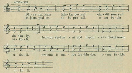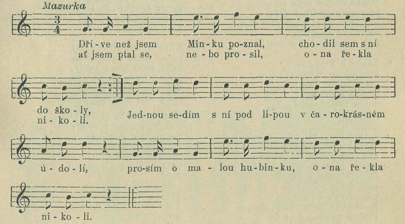 Hojně známosti se dodělalo »Slovíčko nikoli«. Povětšině uslyšíme ji zpívati následujícím nápěvem:
