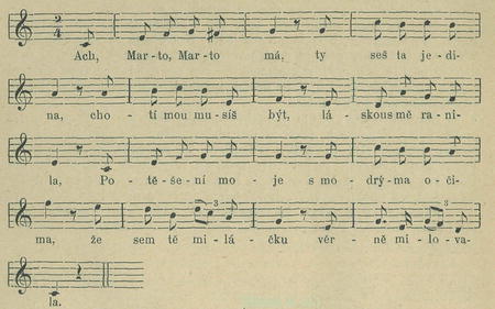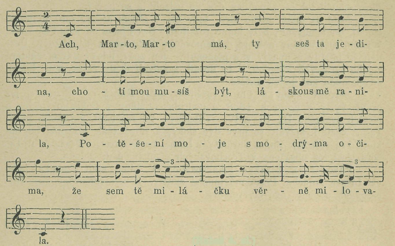 Radosti, žalosti s tebou chci sdíleti, v nejchudší chaloupce chci s tebou bydleti, všecko chci snášeti pro tebe, miláčku, jen příď a ulehči ty mému srdéčku.