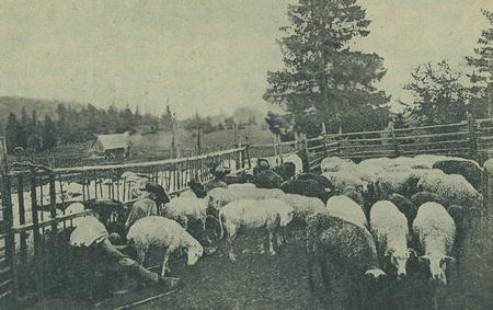 Další rázovilé obrázky vybral Pavel Sochán ze salaše. Z nich zasluhuje pozornosti selankovitý výjev, jak na salaši ve Vážci v Liptovské stolici dojí družina pastýřů ovce. Nedůvěřivě ovečky v popředí vozorují zvědavce a hosta, nezvyklého fotografa (obr. č. 1.).