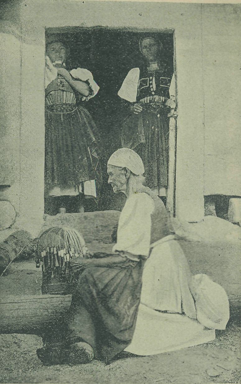 Žnice tamtéž v Ponikách (kroj ženy odvrácené zvláště rázovitý) zachytil Sochán na vyobrazení č. 3.