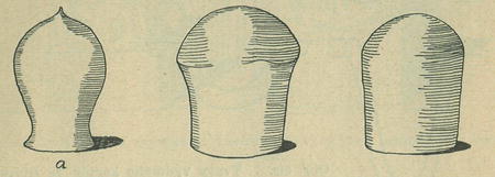 až vznikne kupolovité duté těleso; ve vhodné chvíli pak stisknutím otvor scelí, takže kus hlíny nabude tvaru, jaký mívá vojenský granát. Plochý spodek se pak uřízne a kachel jest hotov. Mnohá kamna mají posud kachlíky tohoto tvaru; a staré kachlíky vykopávané lišily se od novějších jen tím, že jsou (římské) delší a útlejší. Kachlík se pak stává hranatým nebo dostává aspoň hra-