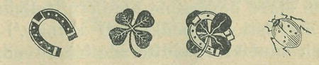 Vyobrazení č. 1.—4: Okrasy knihtiskařské pro štěstí: Podkůvka, Čtyřlístek, Čtyřlístek s podkůvkou, Slunéčko sedmitečné.