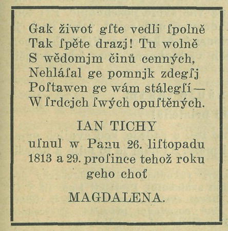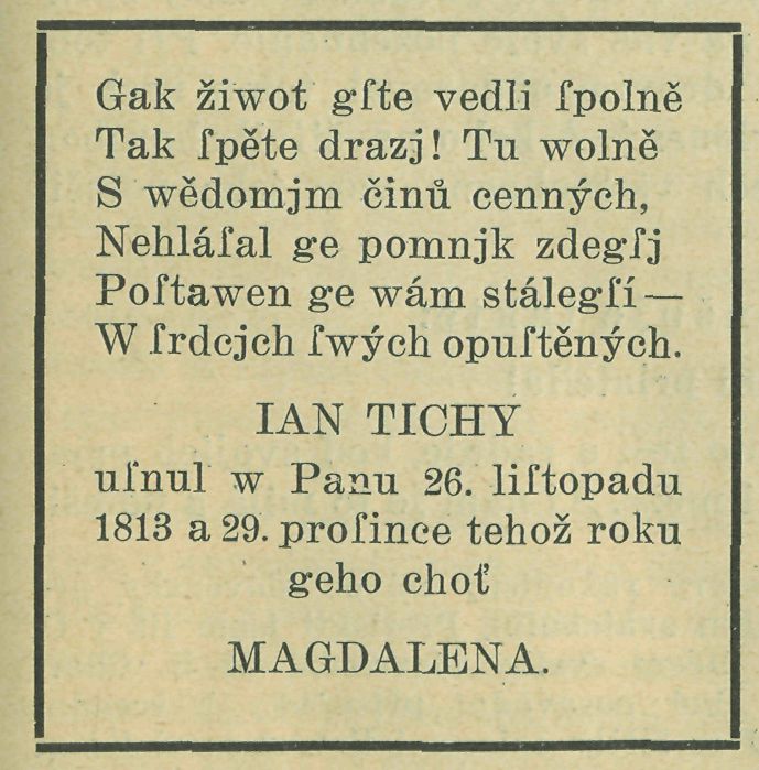 Ze sympatie a úcty k rodině mého dědečka složil náhrobní nápis náš velký Jose fJungmann. Patrně jest onen nápis z prvních po znovuvzkříšení českého národa.