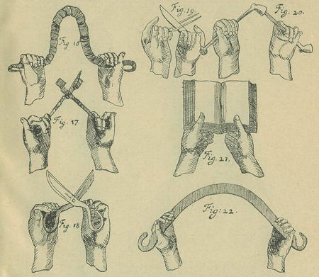 dírkami a drž oba kusy dřeva za dolní konec tyče: proutek tluče, sklání se, ač se ho vůbec tlakem ruky nedotýkáš (fig1. 24., č. 28.). Opře-li člověk pevně o sebe oba ukazováčky (fig. 25., č. 30.) a co možná nejvíce je prohne, skloní se zvolna na to, co toužíš hledati. Má tedy každý kouzelný proutek i v prstech svých rukou.