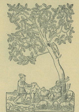 Obr. 3. Pastýř dudá pod stromem. Rytina Davida Kendla r. 1546.
