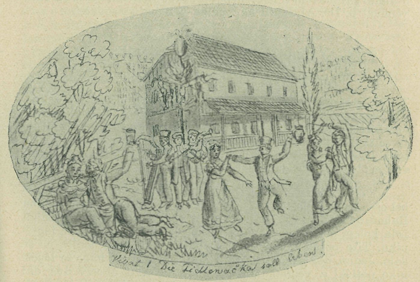 Nejstarší vyobrazení pražské velikonoční slavnosti Fidlovačky r. 1824. Majetek v. r. z. s. Dra Hniličky.