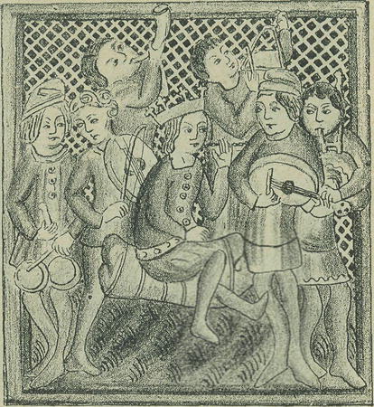 Obr. 9. Dudák ve sboru hudců. Olomoucká bible r. 1417. Kresba M. Wanklové.