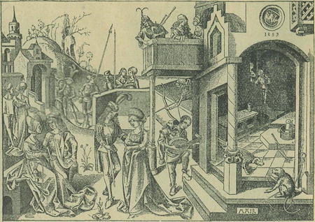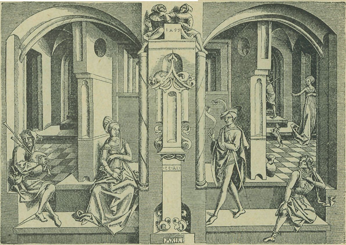 huk a přednice znalecky jsou znázornený. V kabinetu rytin v Mnichově na rytině »Mistra E. S.« ze stol. 15. hraje dudák milencům V zahrado lásky. Kresba v universitní sbírce (Erlangen), poučuje