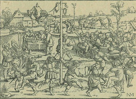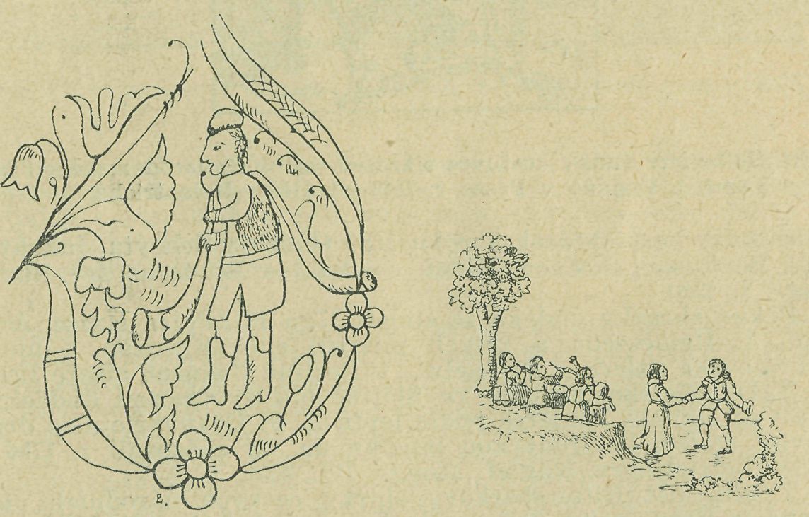 Obr. 19. Slovenský gajdoš. Kresba v Senickém kancionálu r. 1692. Obr. 20. Tanec při dudách v máji. Rytinka česká z konce stol. 18.