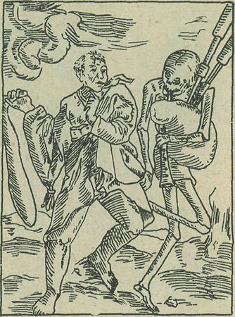 Obr. 21. Holbeinův dudák kostlivec v knize Erasma Rotterodamského (Tanec smrti). Vydáno v Praze r. 1563 od Jiřího Melantricha.
