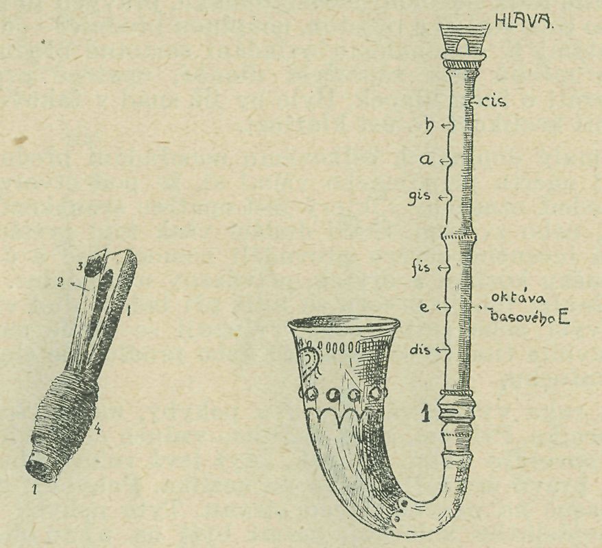 Obr. 27. Piskor (fukačka) z bezové trubičky, jehož chvěním vyluzují se na dudách tóny. Kreslil K. Michalíček. Obr. 28. Přehled tonů na přednici dud, laděných do E-dur. Kreslil K. Michal íček.