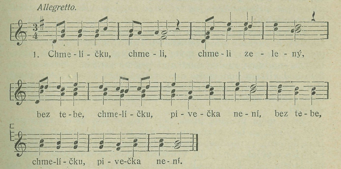 Nápěv vyvinul se ze starodávného tanečního typu jihočeského, podnes nazývaného »do koleěka.« Je to jednoduchá ferina písňová, sroubená z taktů trojčtvrtních o dobách stejného důrazu, po případě s důrazem na době druhé. Melodie netouží po velkém rozpětí, naopak slyšíme téměř výhradně jen bystře Kvapící noty čtvrťové, jež rády opakují se ve stejné výši a jichž