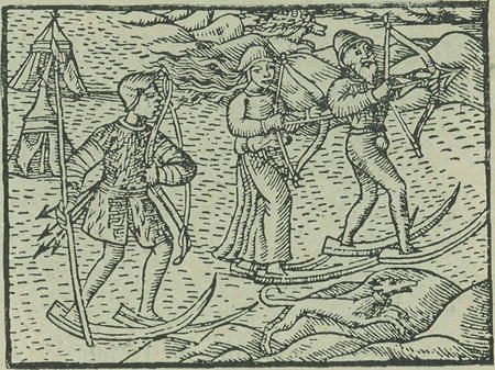 Str. 65 až 66: »Krajina Permia. Permia veliká a široká kra jiná, jest vzdálí od Moskvy 250 mil... V zimě na saních po sněhu se vozívají, zapřáhnouce psy neb bílé jeleny, kterýchž k tomu místo hovad jiných užívají: Pěší pak na koslech, jakž na mnoha místech po Ruské zemi ten obyčej jest, velmi hladce p>o sněhu bšží a říkají jim nárty od ná.rtů. Jsou to deštičky jakési ob-dloužní na způsob podešvu, tří neb čtyř loktův zdélí, kteréžto na nohy obujíce a postrkujíce ss bidlem, na. konci špičatě železem okovaným, velmi prudce se ženou, že žádný kůň i nejhbitější