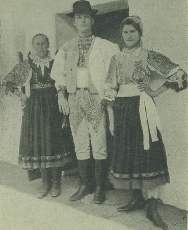 dřevo chránil proti ohni a dešti a učinil teplepším svůj příbytek. Ale již na dálku se oba typy domu liší. Střechy bývají doškové, do štítu i do kopy, někde ještě^bez komínu, jinde s nápadně výzdobným komínem; i ty vypadají jak z bloku okrá-jené. V okolí Myjavy, Brezové se vyskytují stavby jednoposchodové, a obyčejně nebílené, cistě barvou hlíny natřené. V okolí