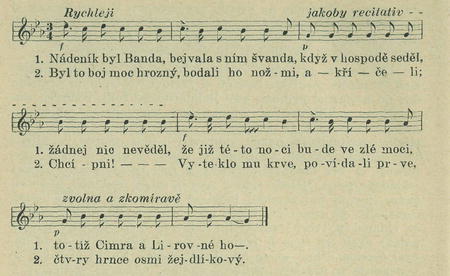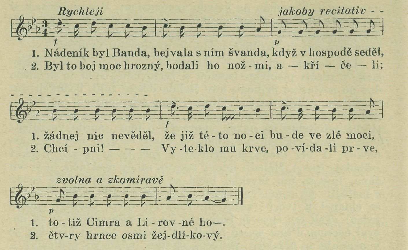 Za povšimnutí stojí, jak lidový zpěvák ve 2. sloce s SU taktem si vedl, když chtěl vyzpívat »a křičeli: »Chcípni!« Také ukončení je pěkné. Když už četníci »zajmuli oba mordéře«, tady je přirozené ukončení celého eposu ą naše lidové zpěváky vůbec nenapadlo jít podle melodie dále.