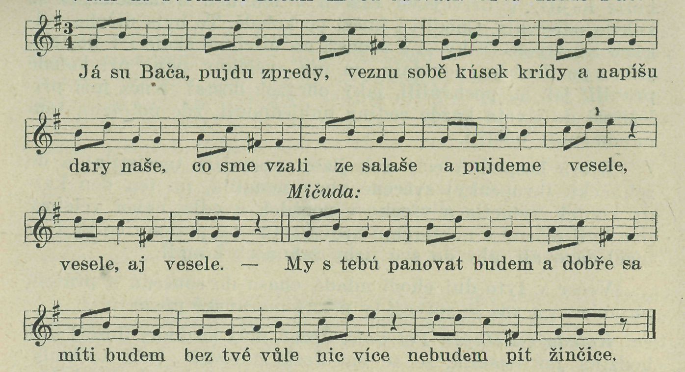 Vešli do světnice, začali ihned zpívati. Prvý začne Bača: