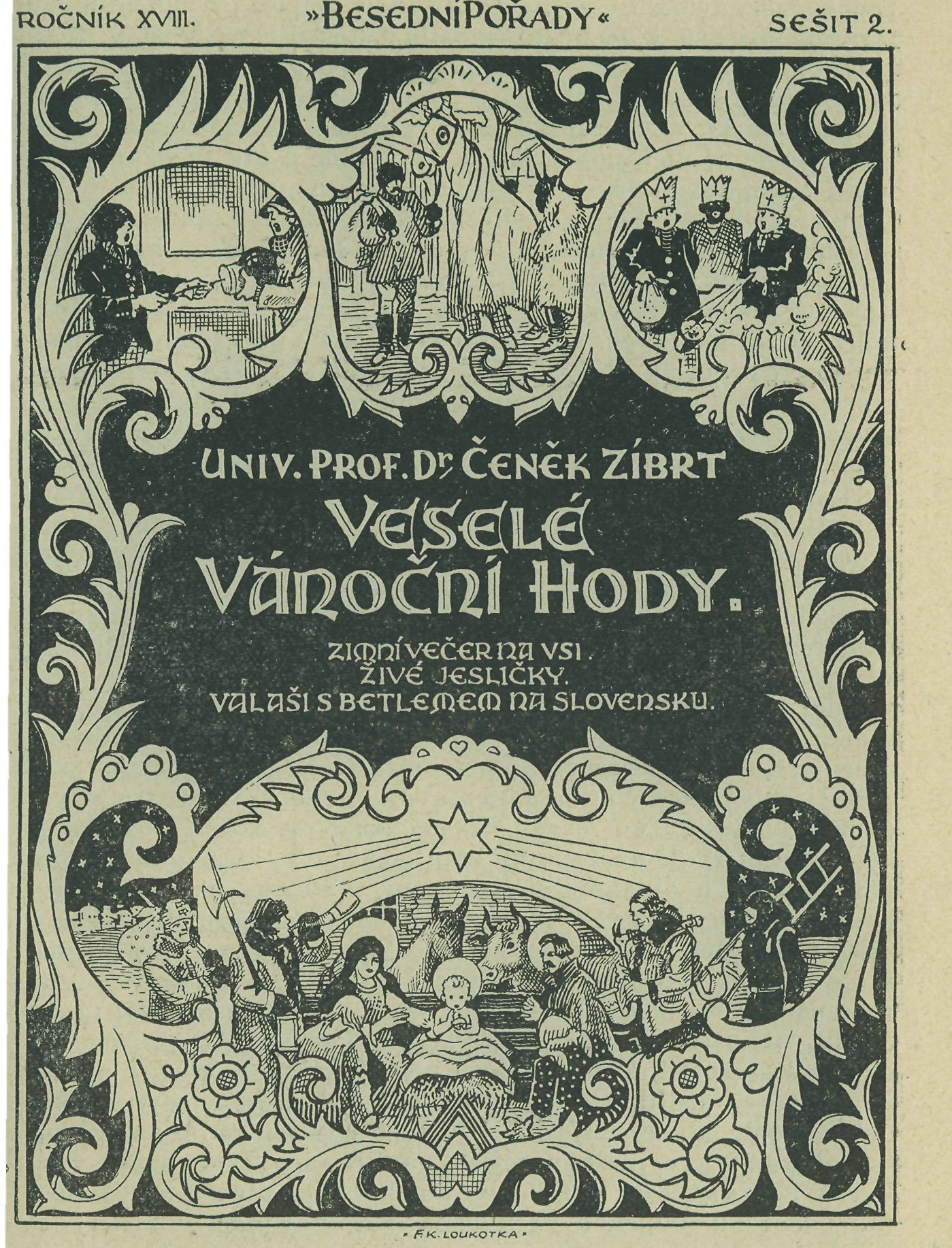 Titulní list Zíbrtovy sbírky divadelních scén ze života lidu československého, »Československý národonisný rok« č. 2. Veselé vánoční hody. Kreslil Frant. Loukotka.