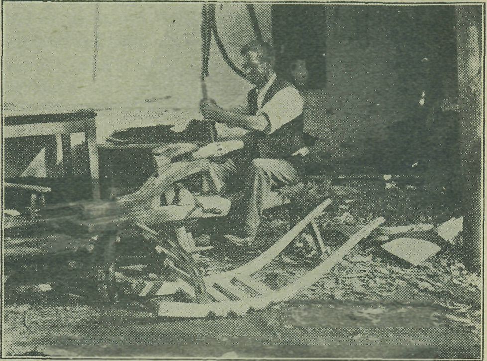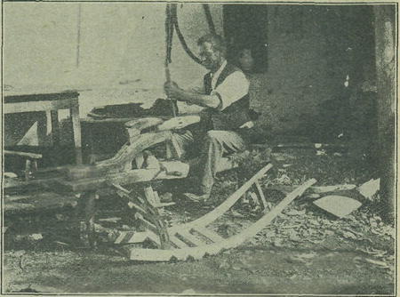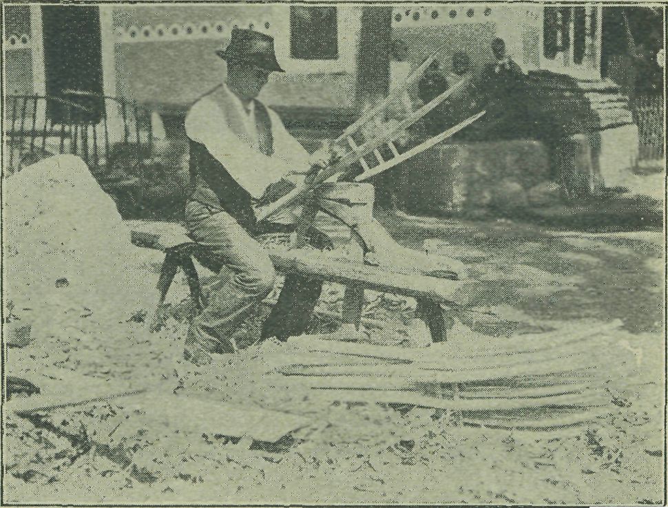 Obr. 3. Jan Horsák z čís. 8 v Držkové hotoví dřevěné vidly na skládání sena. Přede dveřmi budovy stojí dvoukolový vozík na