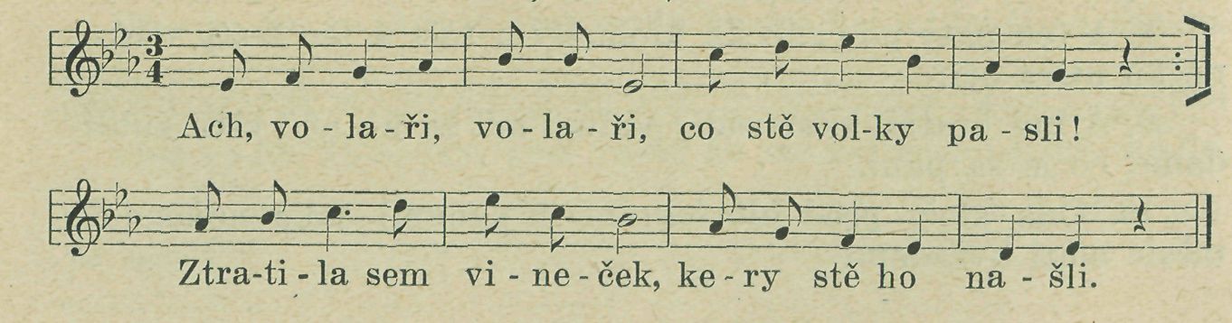3. Kuliły śe, kuliły — ale co! — aj, jabka proti sebe. Komu bych śe dostała — ale co! — aj, jen, synecku, tebe.