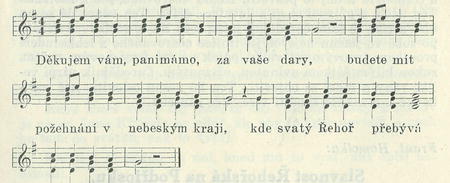 4. Též i Ducha svatýho, co nás osvěcuje; šťastnej dobrej den, páni, náš kantor vinčuje.