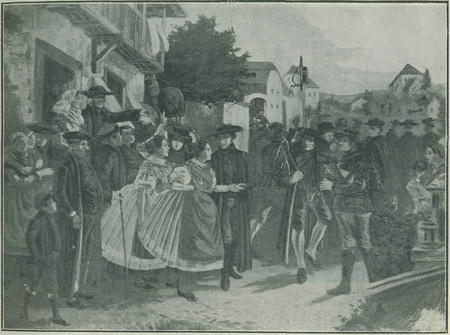 vestu ? otci, který s panímámou stál uprostřed světnice. Vhodně je oslovil, potom nevěsta i ženich poklekli a přijali požehnání. Za to políbili rodičům ruce. Nevěsta loučila se pak s bratry a sestrami dojemným způsobem.