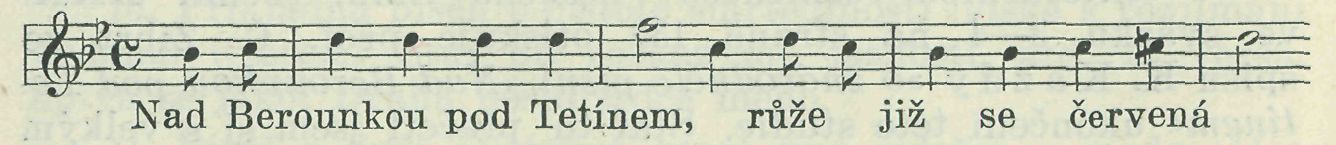 Slovo »plagiát«, třeba zabalené panem Kazdou užité, dotýká se mne bolestně, a proto chci úplně očistiti světlou památku hudebního skladatele Vorla od tvrzení, že »Vorel byl autorem znárodnělého nápěvu (Růže tetínské), který nevyniká originalitou«, jak tvrdí pan Kazda. Ukládám své názory o této věci v následující ukázce. Počáteční motiv Vorlovy Růže tetínské jest: