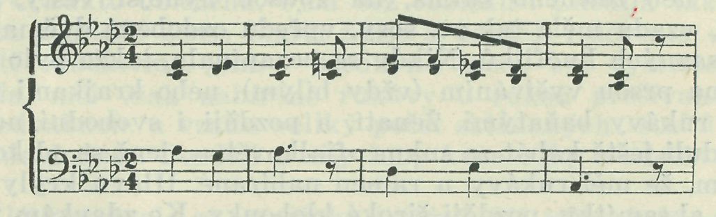 Abych ? závěrku ještě podepřel své tvrzení o »dvojencích« také při hudebním tvoření, uvádím ještě — Beethovena! Kde by se ten byl dostal k české národní písni, třeba že několik dnů dlel v Praze1? Prosím, srovnejte, co napsal Beethoven jako úvod své skladby »Adagio du sextuor«, opus 81 b: