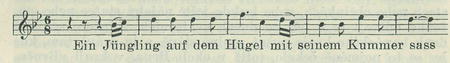 Je tu podoba, avšak zajisté jen nahodilá! Dovoluji si pro bezvýznamnost té »podoby« uvésti jinou skladbu. Je to píseň »Dfer Jüngling auf dem Hügel«, kterou složil »král písní« Frant. Schubert, opus 8, Nr. 1.: