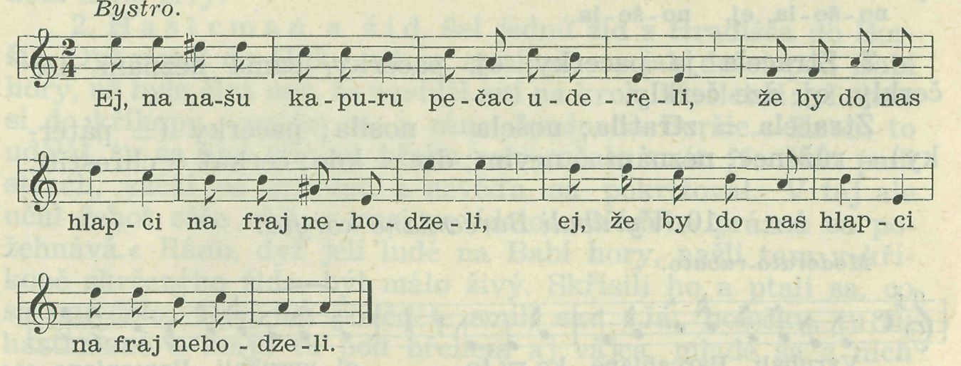 3. Hodz by udereli zlatého holuba, každý idze lem tam, dze mu dzevka ľúba, ej, každý idze lem tam, dze mu dzevka ľúba.