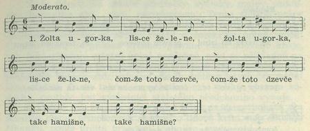 Žolta ugerka, žlutá okurka; lišce želené, listí zelené; čom-že, proč-že; hamišný (maďař.), falešný; bo ši pytavával, neboť jsi prosíval; bo še ja nebizovala (maď.), neboť jsem ti nedůvěřovala; huncút, ničemník; vecej, více.