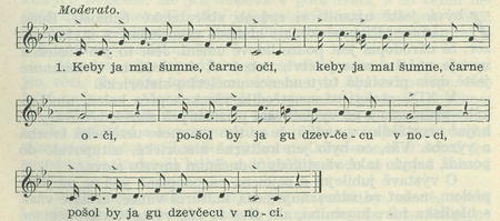 Šumný, pěkný; čarne oči, černé oči; gu dzevčecu, ? děvčici.