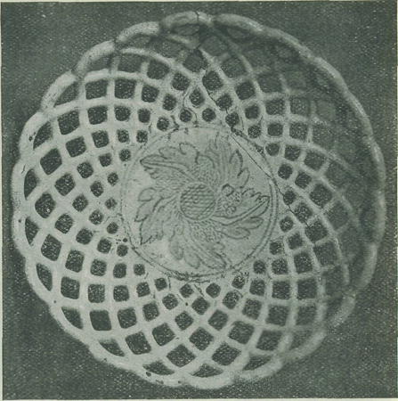 jsou nádoby tohoto tvaru nejpočetněji zastoupeny v památkovém materiálu, jak již ostatně bylo poznamenáno. Mají široký klenutý okraj, mřížovitě, srdcovitě a různě jinak, složitěji a bohatěji prolamovaný; pevná plocha středu, na níž je umístěna výzdoba, je obyčejně mírně vypouklá; spočívá na nižší nebo vyšší nožce, obyčejně zvonovité rozšířené, hladké nebo profilované (obr. 2—13). Hned za ně se počtem řadí džbánky s obloukovým uchem, o nichž se v inventářích rovněž činí zmínka
