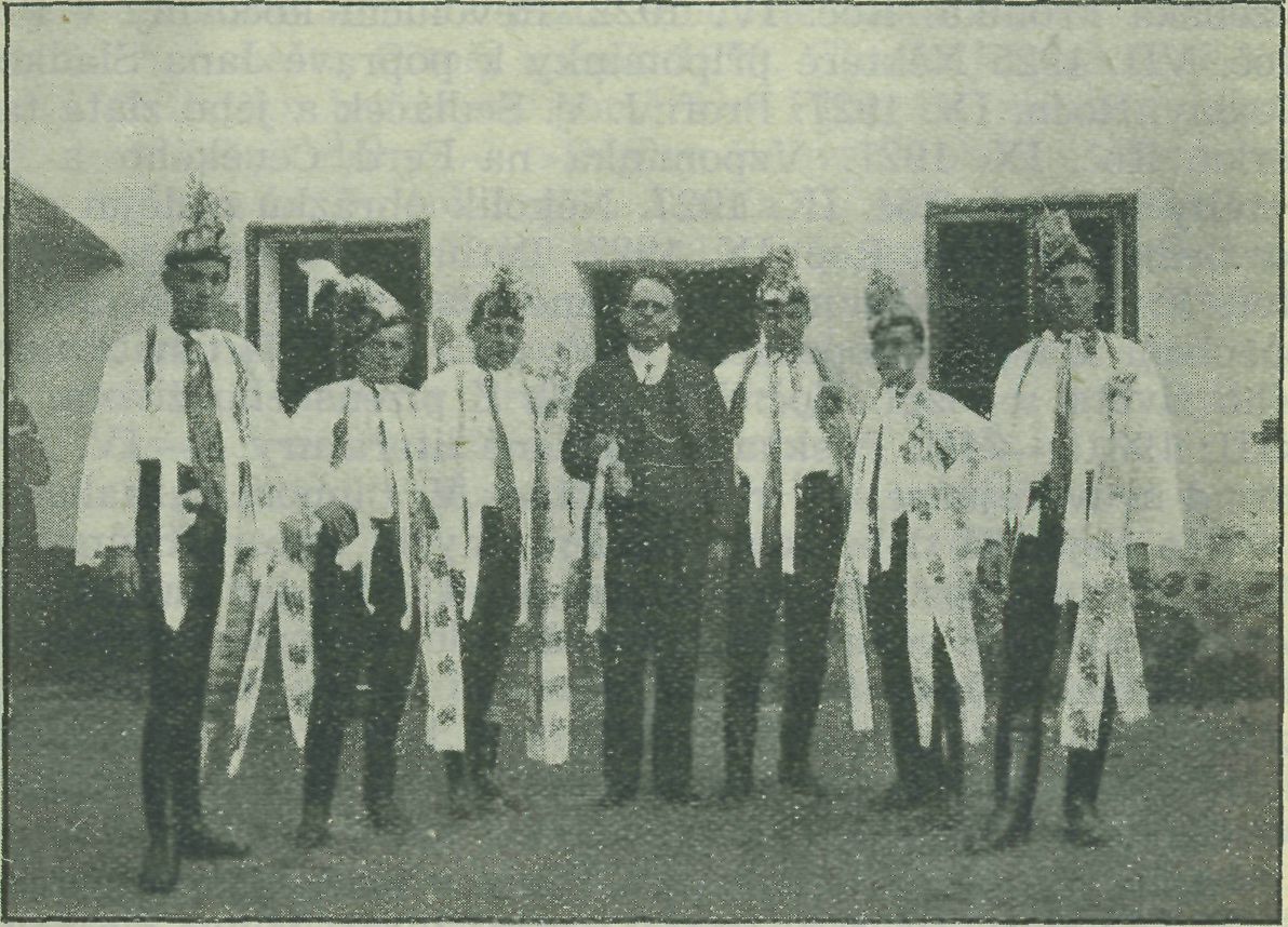 Farář od s v. Štěpána v Praze Frant. Malý uprostřed junáků lanžhotských. (Fotografoval Fr. Malý.)